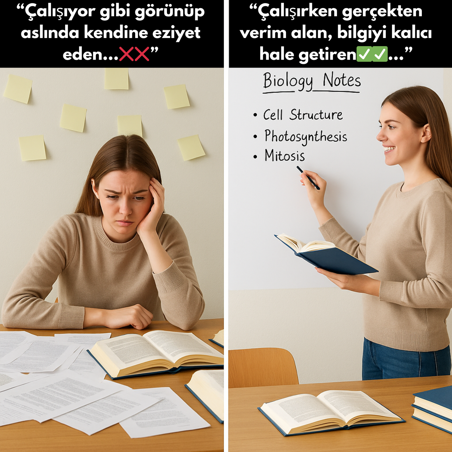 Saatlerce masanın başında oturup ders çalışıyor gibi görünmek… ama aslında hiçbir şey akılda kalmıyor. ❌